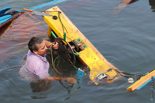Рыбак пытается спасти свою лодку, смытую цунами в портовом городе Икике.