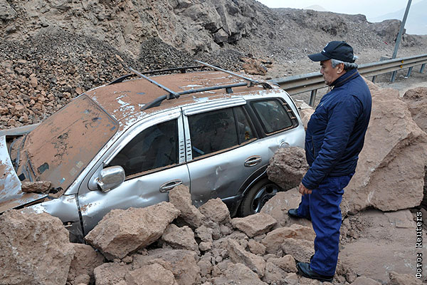 Спасатель оценивает последствия землетрясения в чилийском городе Икике.