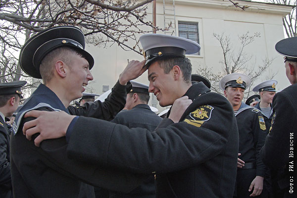 Курсанты-украинцы, покидающие Нахимовское военно-морское училище в Севастополе, прощаются с однокурсниками-россиянами перед отъездом в Одессу.