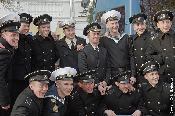 Курсанты-украинцы, покидающие Нахимовское военно-морское училище в Севастополе, фотографируются на память с однокурсниками-россиянами перед отъездом в Одессу.
