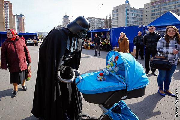 Дарт Вейдер заглядывает в детскую коляску в центре Киева.