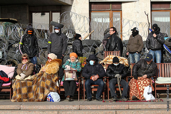 Люди на баррикадах у входа в здание регионального парламента в Донецке.
