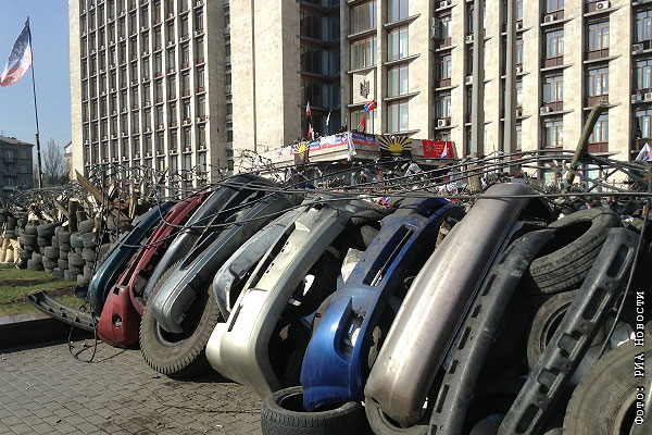 Баррикады вокруг здания областной госадминистрации, захваченного митингующими в Донецке.