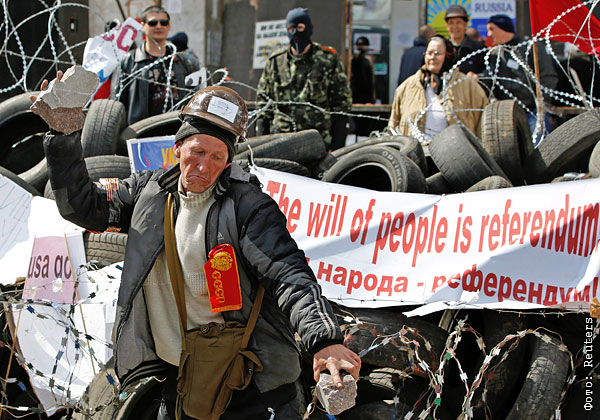 Протестующие на баррикадах у здания областной администрации в Донецке.