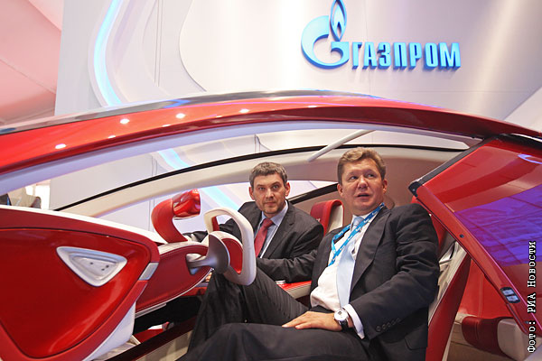 Глава ОАО "Газпром" Алексей Миллер (справа) осматривает образец "е-мобиля" на стенде компании на XI Международном инвестиционном форуме "Сочи-2012".