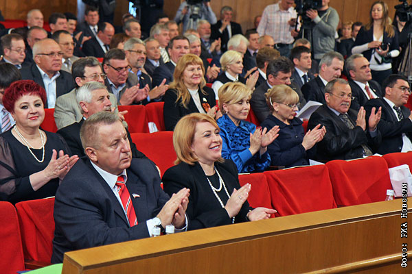 Председатель Конгресса русских общин Крыма Сергей Шувайников и директор завода шампанских вин "Новый свет" Янина Павленко во время заседания Государственного совета Республики Крым в Симферополе.