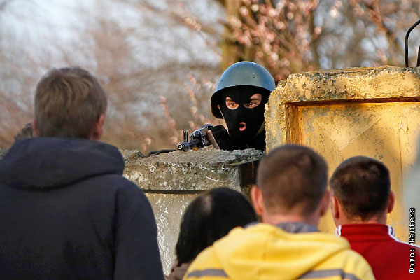 Украинский солдат и активисты Антимайдана вблизи авиабазы Краматорска.