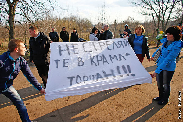 Силы самообороны Краматорска утверждают, что армейский вертолет в четверг утром, прикрывая колонну украинской бронетехники, пытающуюся прорваться к аэродрому, открыл огонь, пострадали мирные жители.