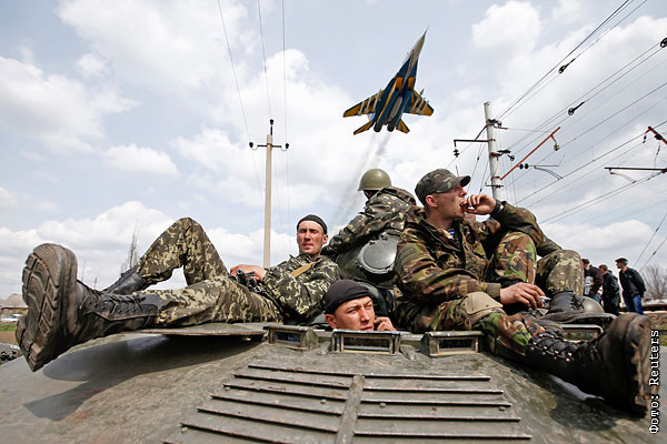 Украинские солдаты сидят на бронетранспортере в Краматорске.
