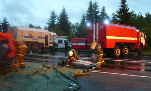 Работа спасательных служб на месте крушения пассажирского самолета Ту-134 авиакомпании "РусЭйр", совершившего аварийную посадку недалеко от взлетно-посадочной полосы аэропорта Петрозаводска.