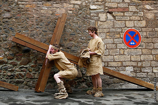 Итальянские актеры, принимающие участие в пьесе-реконструкции распятия Христа, пытаются поднять крест.