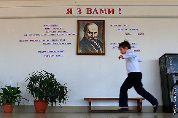 Ученик симферопольской школы бежит по коридору. На стене портрет украинского поэта Тараса Шевченко.