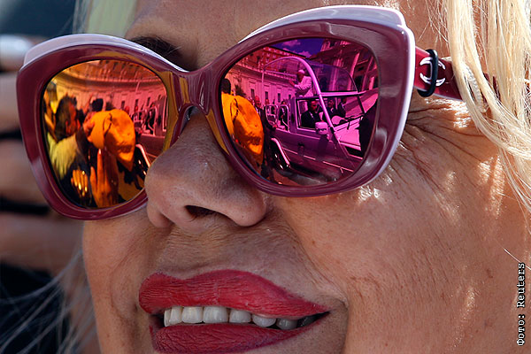 "Папамобиль" отражается в линзах очков туристки в Ватикане.
