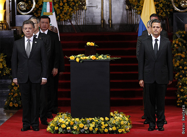 Президент Колумбии Хуан Мануэль Сантос и его мексиканский коллега Энрике Пьена Ньето рядом с урной с прахом писателя Габриэля Гарсиа Маркеса.
