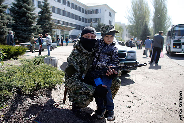Вооруженный мужчина в балаклаве позирует с ребенком возле администрации города.