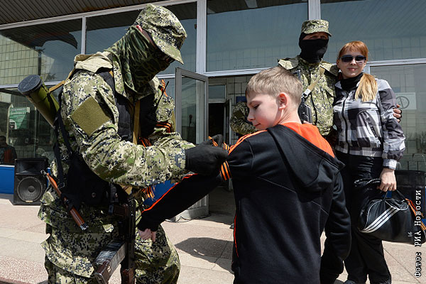 Ополченец повязывает георгиевскую ленточку юному защитнику Константиновки Донецкой области.