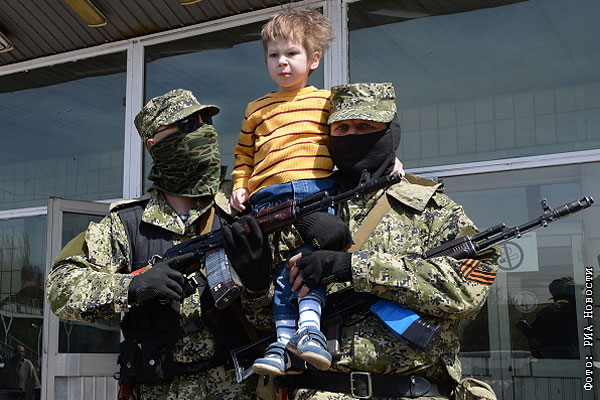 Ополченцы фотографируются с ребенком у захваченного здания городского совета Константиновки Донецкой области.
