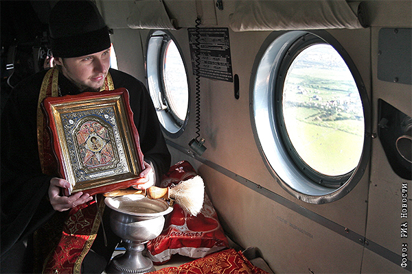 Священник Симферопольской и Крымской епархии Московского патриархата отец Василий держит икону Божьей матери "Неопалимая Купина", которая считается защитницей от пожаров и стихийных бедствий, во время облета крымской земли на вертолете МИ-8 МЧС России.