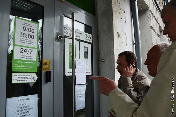 Жители Донецка у офиса Приватбанка на улице Горова в Донецке. Приватбанк временно приостановил работу своих офисов и банкоматов в Донецкой и Луганской областях.