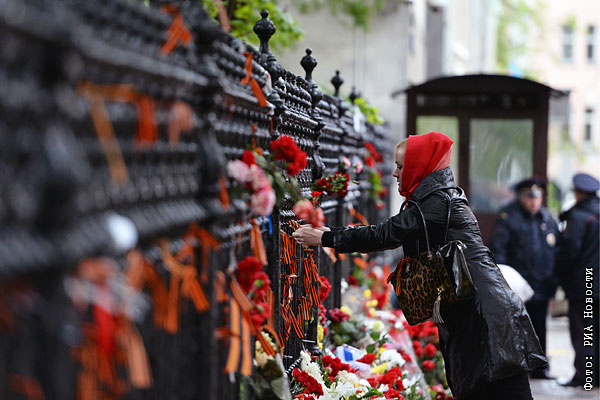 Москвичи возлагают цветы у посольства Украины в память о погибших в Одессе.