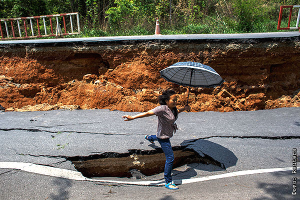 Женщина с зонтиком прыгает через яму в разрушенной землетрясением дороге.