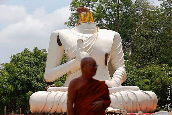 Буддийский монах стоит перед разрушенной статуи Будды на севере Таиланда.