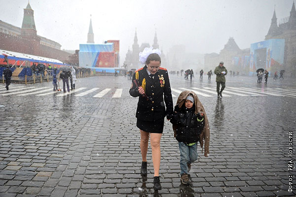 Майский снегопад на Красной площади в Москве, где проходит подготовка к празднованию Дня Победы.
