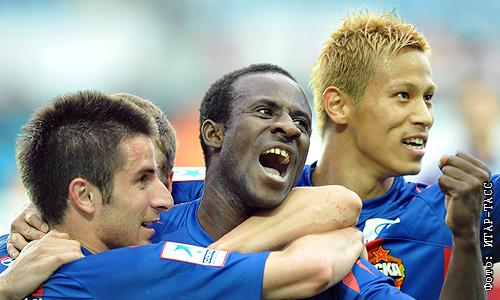 Игроки ЦСКА Зоран Тошич, Сейду Думбия и Кейсуке Хонда (слева направо) после забитого гола в матче чемпионата России по футболу: ЦСКА (Москва) - "Локомотив" (Москва).