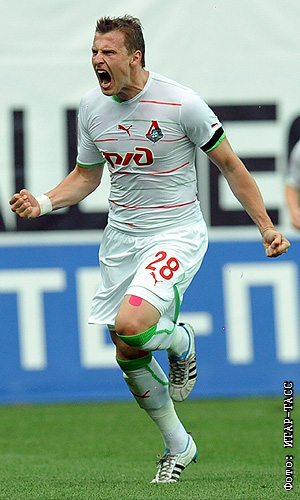 Игрок "Локомотива" Ян Дюрица после забитого гола в матче чемпионата России по футболу: ЦСКА (Москва) - "Локомотив" (Москва).