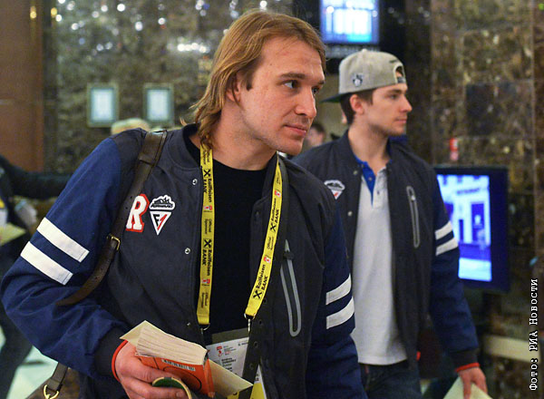Игрок сборной России по хоккею Андрей Зубарев (слева) в холле "Президент-отеля" в Минске.