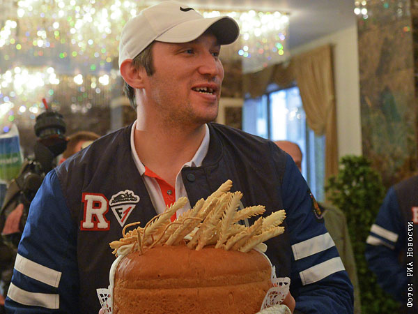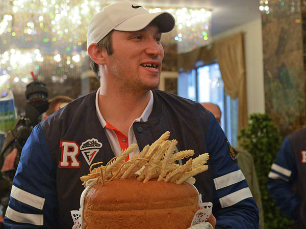 Игрок сборной России по хоккею Александр Овечкин держит каравай победы, который хоккеистам преподнесла администрация гостиницы, в холле "Президент-отеля" в Минске.
