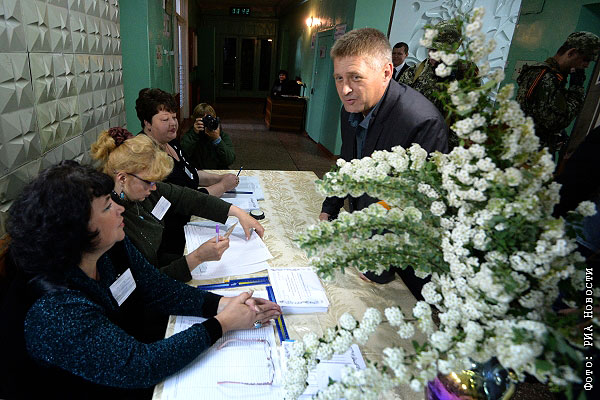 "Народный мэр" Славянска Вячеслав Пономарев голосует на референдуме о статусе самопровозглашенной Донецкой народной республики на избирательном участке в Славянске.