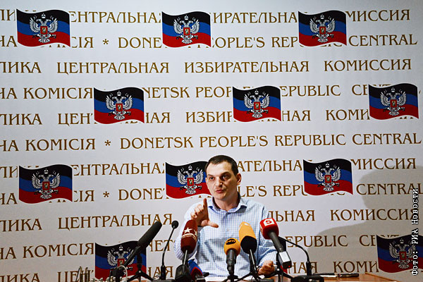 Глава ЦИК "Донецкой народной республики" Роман Лягин отвечает на вопросы журналистов во время пресс-конференции по итогам референдума о статусе самопровозглашенной Донецкой народной республики.