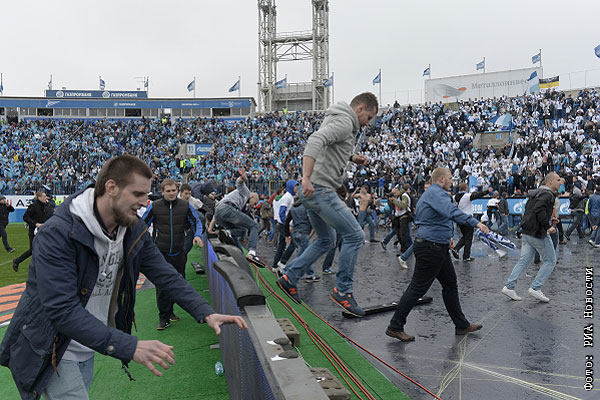 Фанаты "Зенита" выбежали на поле в концовке встречи с командой "Динамо", матч был остановлен на 86-й минуте при счете 4:2 в пользу москвичей. Центральный матч 29-го тура чемпионата России по футболу в Санкт-Петербурге не был доигран из-за беспорядков на стадионе.