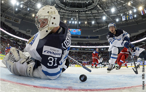 Вратарь сборной Финляндии Микко Коскинен (слева) пропускает гол в свои ворота.