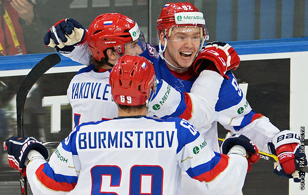 Игроки сборной России Егор Яковлев, Александр Бурмистров и Евгений Кузнецов (слева направо) радуются забитому голу в матче группового раунда Чемпионата мира по хоккею 2014 между сборными командами России и США.