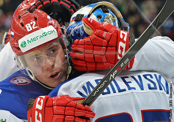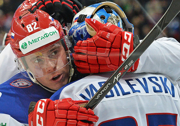 Игрок сборной России Евгений Медведев (слева) и вратарь сборной России Андрей Василевский радуются победе в матче группового раунда Чемпионата мира по хоккею 2014 между сборными командами России и США.