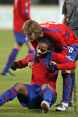 Армейцы Вагнер Лав и Эркин Джанер в матче Кубка УЕФА по футболу: ЦСКА (Россия) – "Шахтер" (Донецк) – 1:0