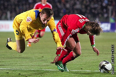 Игроки "Ростова" Александр Черкес и "Локомотива" Дмитрий Сычев (слева направо) в матче чемпионата России по футболу: "Ростов" (Ростов-на-Дону) - "Локомотив" (Москва) - 1:1