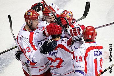 Игроки "Локомотива" после победы в матче полуфинала чемпионата КХЛ: "Металлург" (Магнитогорск) – "Локомотив" (Ярославль) – 0:4