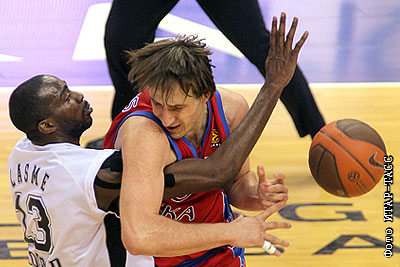 Игрок "Партизан" Стефан Ласме и армеец Матьяж Смодиш (слева направо) в матче Евролиги УЛЕБ по баскетболу: ЦСКА (Россия) - "Партизан" (Сербия) - 56:47