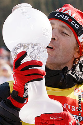 Норвежец Оле-Эйнар Бьорндален, выигравший большой хрустальный глобус по итогам общего зачета Кубка мира по биатлону