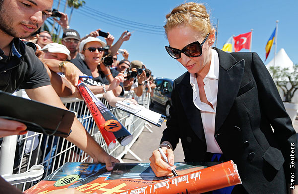 Актриса Ума Турман дает автографы поклонникам на набережной Круазетт.
