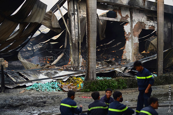 Пожарные возле сгоревшей обувной фабрики в провинции Бинь Дуонг.