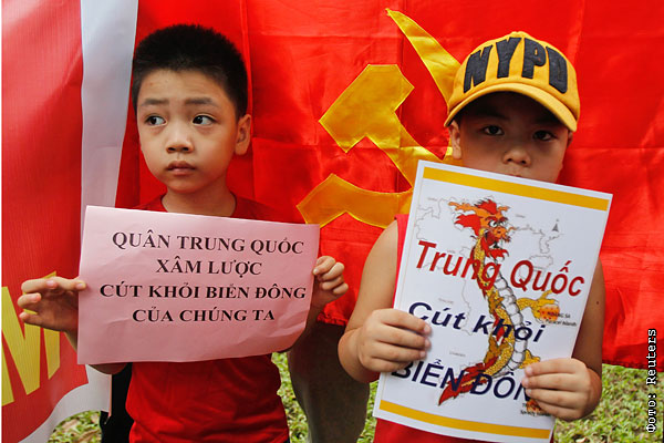 Дети держат плакаты во время акции протеста перед китайским посольством в Ханое.