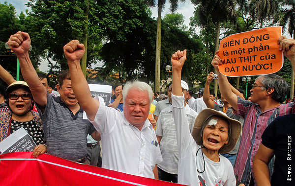 Протестующие скандируют лозунги возле китайского посольства в Ханое.