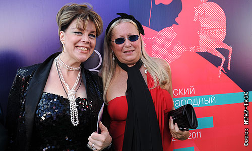 Оперная певица Любовь Казарновская и президент Благотворительного фонда "Русский Силуэт" Татьяна Михалкова (слева направо) перед началом церемонии открытия 33-го ММКФ в кинотеатре "Пушкинский".