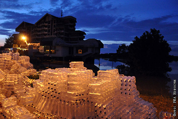 Бутылки с питьевой водой в затопленном городе Обреновац в Сербии.