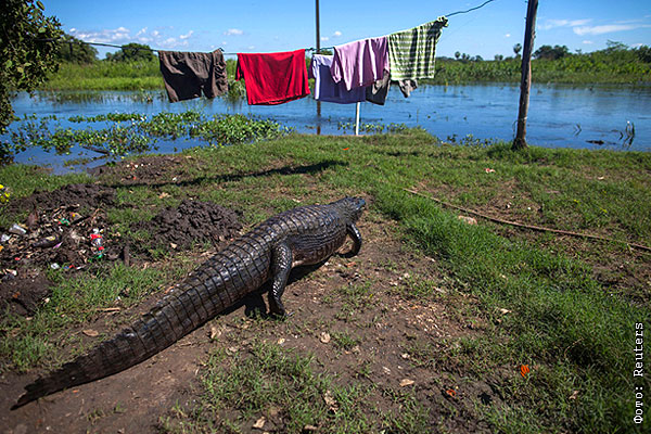 Почти прирученный 55-летней бразилианкой кайман ползет, нет, не снимать белье, а получить порцию мясных обрезков, которые Мария де Баррос скармливает своим питомцам.