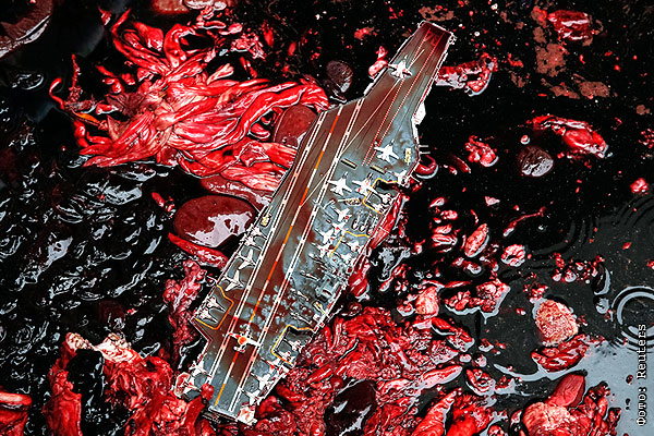 Кровавый перформанс членов украинской партии "Демократический альянс" перед французским посольством в Киеве. В надувной бассейн они залили вместе с водой потроха и пустили туда модели военных кораблей. Цель акции - повлиять на решение французов продавать России десантные вертолетоносцы класса "Мистраль".